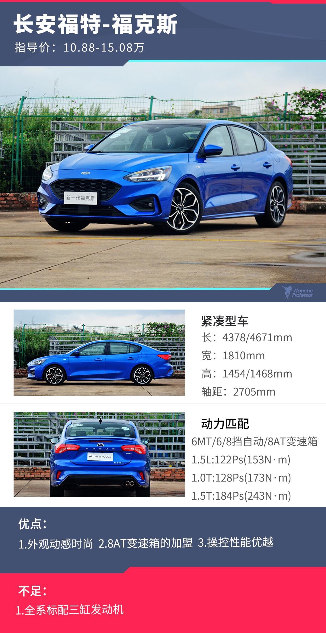 作为三者中资历最老的福克斯正式完成了换代上市任务,官方指导价为10.88-15.08万:按照惯例推出两厢和三厢两个版本,并在各自的基础上再细分出7款配置,总数有14款车型可供消费者选择,此外还顺应潮流推出国六发动机和首次在福克斯上现身的ST-Line运动外观套件。不过全系标配三缸发动机还没登场便将新福克斯推向了舆论的风口浪尖。争议与赞美并存的新福克斯究竟表现如何?
