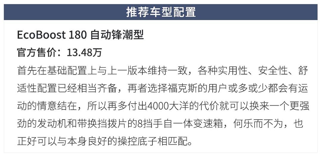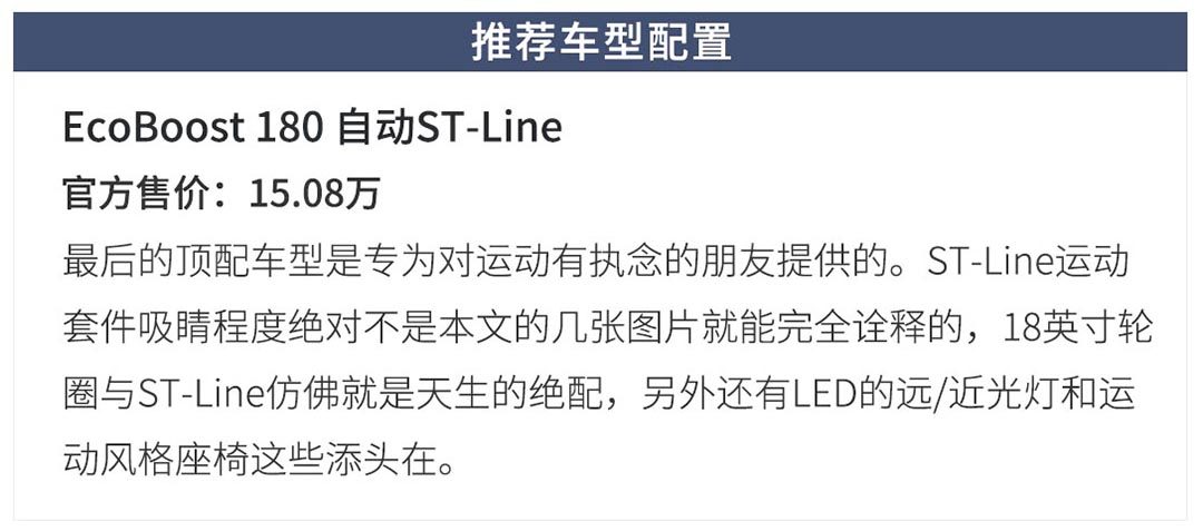 综上,新福克斯的改变是喜人的,ST-Line运动套件的加入加强了运动属性,尺寸的加大带来更大的乘坐空间、全新的内饰也更贴合时下的潮流了,而且还将运动性能继续发扬光大。表现越发全面的福克斯看似已经做好上演王者归来好戏的准备,至于最后能否如愿,就要看屏幕前的你能否接受这全系三缸的事实。
