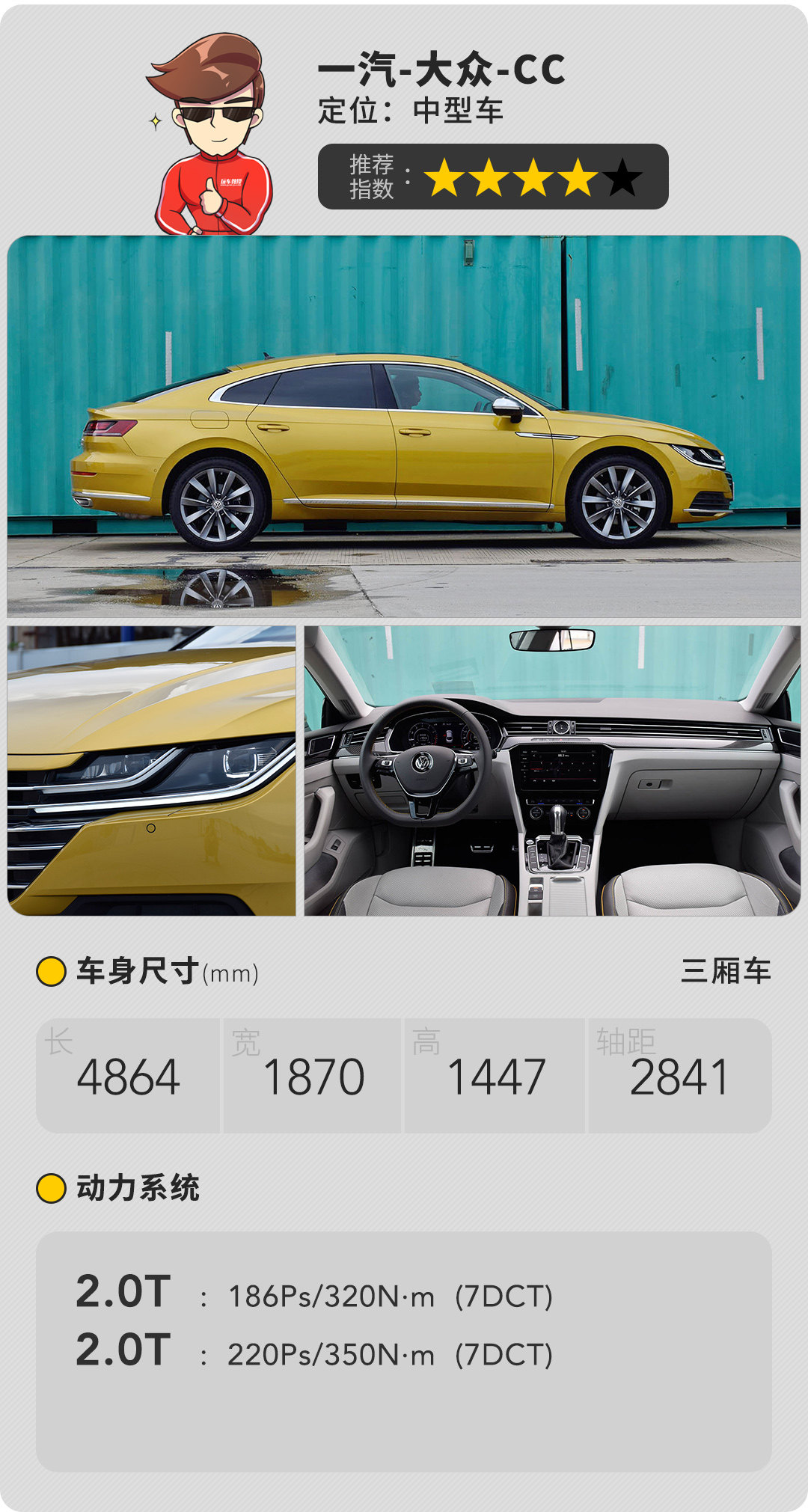 好吧,说那么多CC还是销量不行,纠其原因除了轿跑车型在国内都够不还卖之外,较高的定价也让许多消费者下不了手。顶着“最美大众”的称号,第一代大众CC上市后马上获得消费者的芳心,一度成为豪华品牌之外的不二之选。只是新一代CC的上市,曾经号称“最美大众”的它突然间成了迷之自信的代名词。目前有着2万左右的终端优惠,但落地价格依然偏高,如果你是追求“美”多过最求“又大又实用”的消费者,CC还是很值得去深入了解。