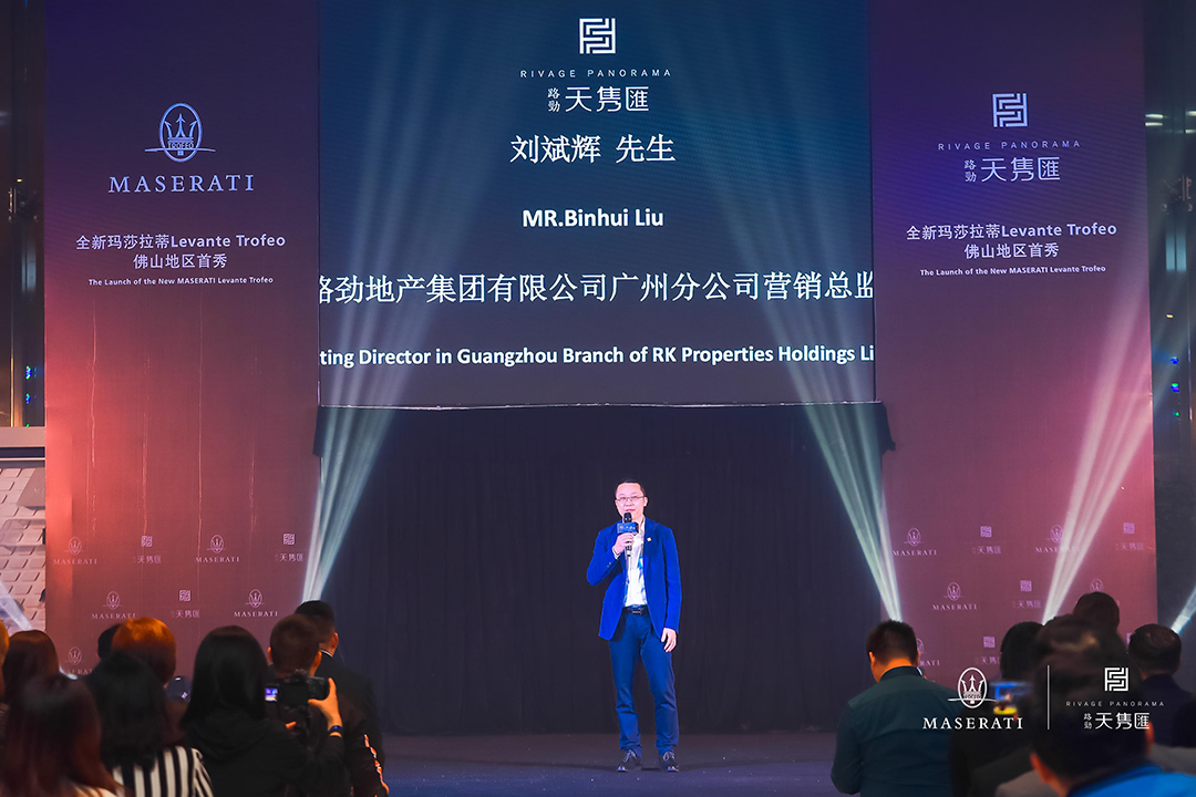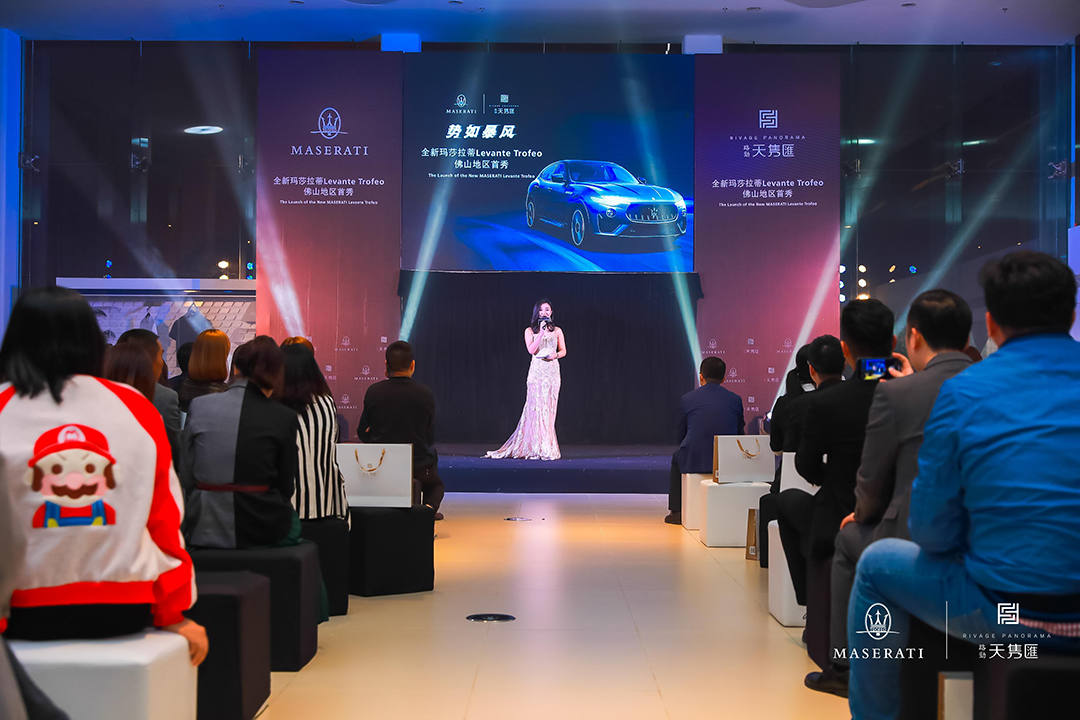 此次的新车上市发布会以一段歌手表演开场,主持人简单地为来宾介绍了本次发布会的内容后。佛山鸿粤晨丰顺德玛莎拉中心总经理余彬先生、路劲地产集团有限公司广州分公司营销总监刘斌辉先生共同为本次玛莎拉蒂全新限量版高性能SUV Levante Trofeo佛山发布会致辞。