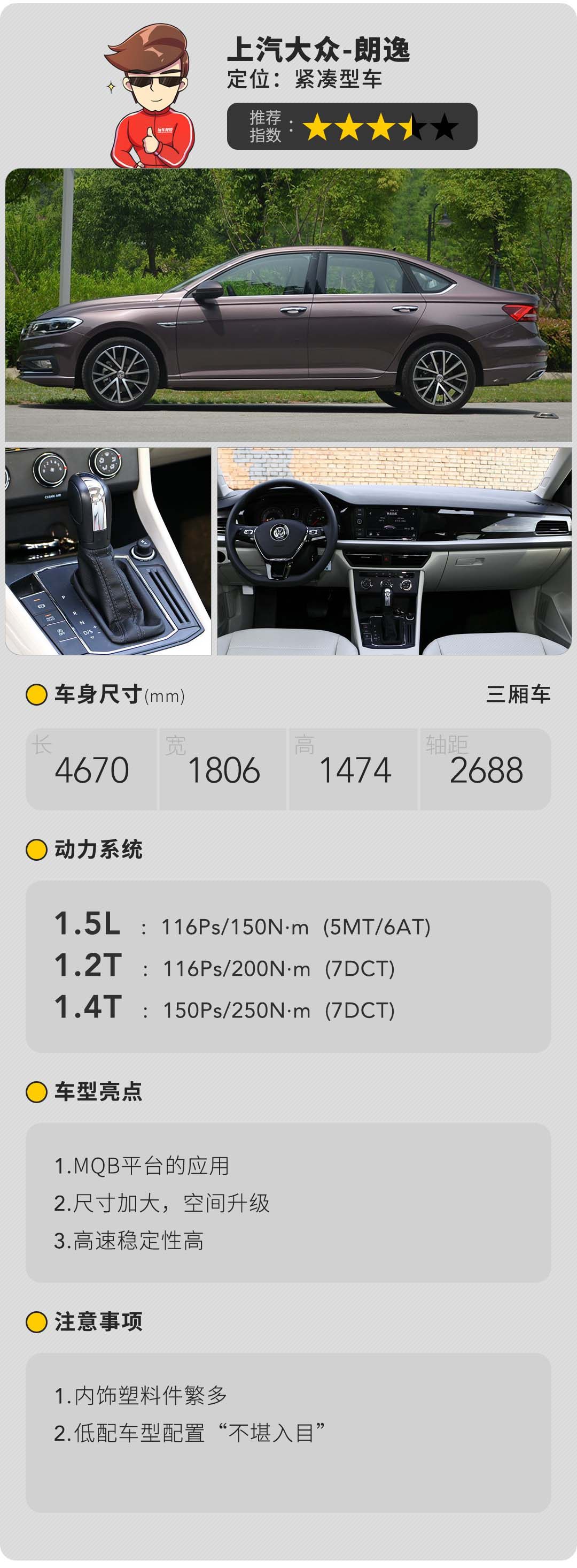 陪着350万用户走过10年漫长岁月的朗逸终于在今年迎来了换代的春天,全新朗逸依旧是省心家用的代名词,向新CC看齐的外观真的是越来越契合“这车看起来比较高级”的言论,MQB平台的下放,底盘厚重感更加突出,也就是我们俗称的“德味”更浓了,此外尺寸的全面升级,连带着乘坐空间一起增加。