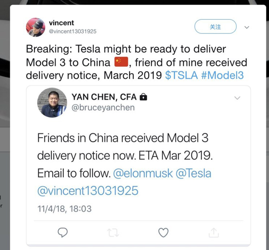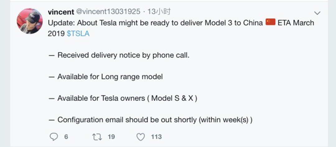 近日,有推特用户vincent透露,他的中国朋友收到特斯拉打来的电话,通知可以在2019年三月提他预定的Model 3了。而在不久前的财报会议上,特斯拉CEO马斯克表示明年二月份后期或三月份会向欧洲市场交付Model 3,而亚太地区要等到第二季度,一下子提前那么多,不免让人感觉幸福来得太突然。