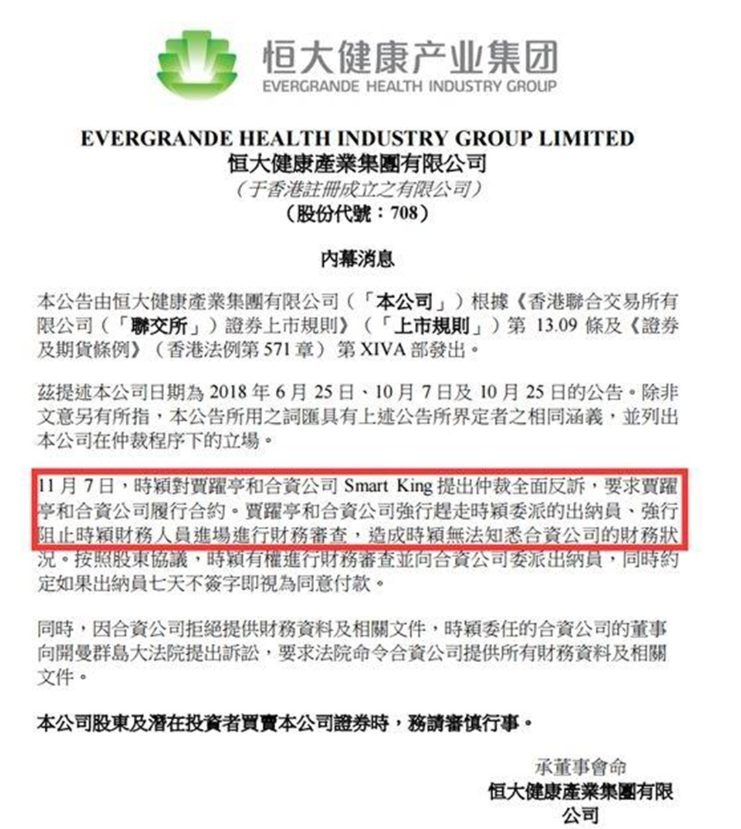 11月7日晚,恒大健康公告称贾跃亭和合资公司强行赶走恒大委派的出纳员、阻止恒大财务人员进场进行财务审查,造成恒大无法知悉合资公司的财务状况。因此恒大要对贾跃亭和合资公司SmartKing提出仲裁全面反诉。
