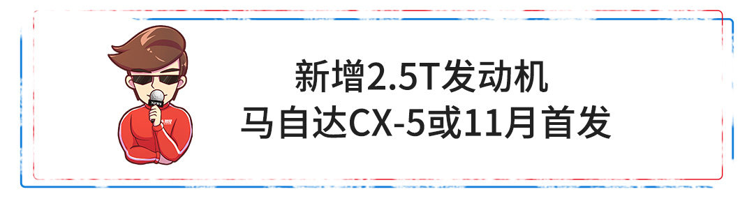 日前,马自达发布了新款CX-5官图,预计将于11月28日开幕的洛杉矶车展首发。新车外观与现款基本一致,内饰细节将稍有调整。新车较大的变化在于2.5T发动机的加入,该款发动机最大功率250马力,峰值扭矩421牛·米,匹配6速自动变速箱,新增的2.5T发动机在数据方面都领先于目前2.0L/2.5L自然吸气发动机,这将会给新款CX-5带来怎样的驾驶感受?值得期待。