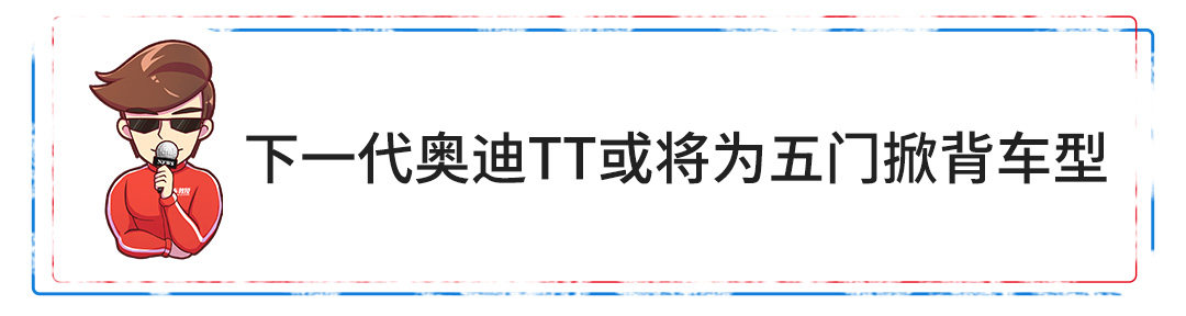 近日,有外媒报道称下一代奥迪TT将全面转型,将于2020年亮相。新车取消了两门硬顶以及两门敞篷的设计,提供新的五门掀背式轿车。据悉新车将继续采用MQB平台打造,轴距加长120mm,整体尺寸与三厢版奥迪A3看齐,动力则继续使用2.0T发动机+7速双离合的动力总成,有望加入混动系统。同时,TTS以及TT RS也将改成Sportback设计,如此一来奥迪在入门级轿跑车的市场有了与奔驰CLA竞争的车型。目前该消息尚未得到官方确认,更多有关新车的消息还有待官方发布。