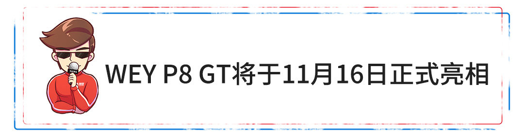 有相关媒体报道称WEY P8 GT将于11月16日开幕的广州车展正式亮相。新车最大的亮点在于轿跑SUV的造型,其整体设计风格与WEY P8相似,但在P8的基础上进行了修改,整体视觉效果十分锐利。WEY P8 GT与P8一致,均为插电式混合动力车型,更多有关新车的详细参数,还有待官方公布。