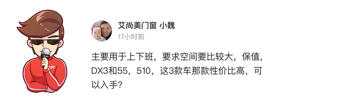 而剩下的两者,综合性价比、保值率、空间,我会选择510,首先保值率在上文处已经得到了体现,其次在性价比方面然后性价比方面510指导价不足7万的车型就已经配备了定速巡航、全景和电动天窗、仿皮座椅、带手机互联的8英寸中控大屏、自动空调等配置,而DX3与之相匹配的车型指导价已突破9万大关。虽然DX3的车身尺寸是要优于510,但是反应到实际的内部腿部空间也只是3指-4指的差距。而且510在有限的成本范围内利用撞色的设计方案和恰当好处的镀铬饰条,观感已不输DX3。