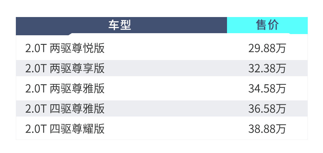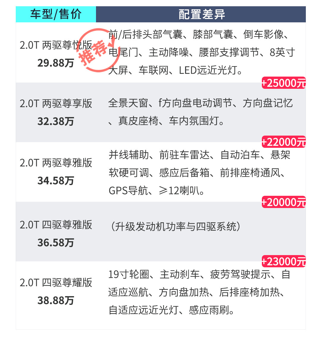 再其次前/后排头部气囊、膝部气囊、倒车影像、定速巡航、电尾门、无钥匙进入/启动、反向盘换挡、主动降噪、腰部支撑调节、8英寸大屏、LED远近光灯、温度分区控制等都为全系标配。