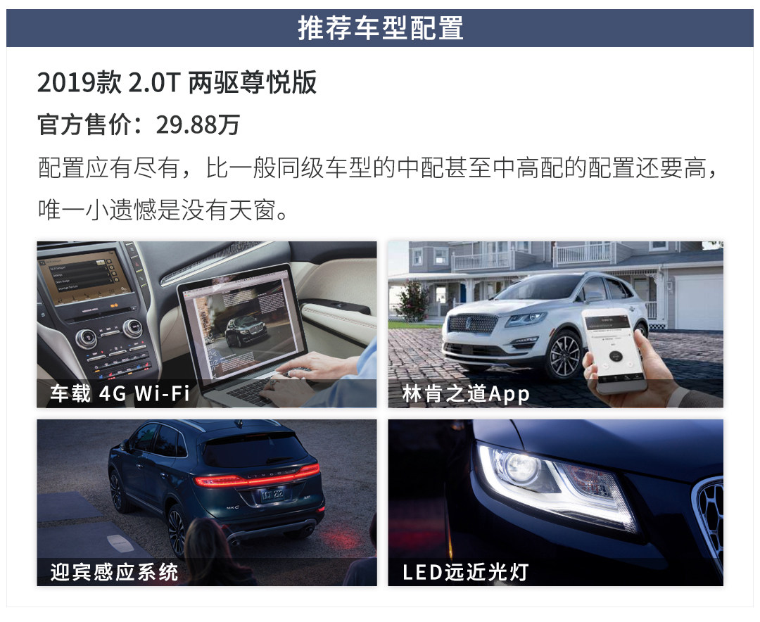 从上面的配置对比表格中可以看出,新款MKC的标准配置已经非常丰富了,所以毫无疑问最低配车型的性价比是最高的,至于那个一年开不到几次的天窗,大家就不要去纠结了