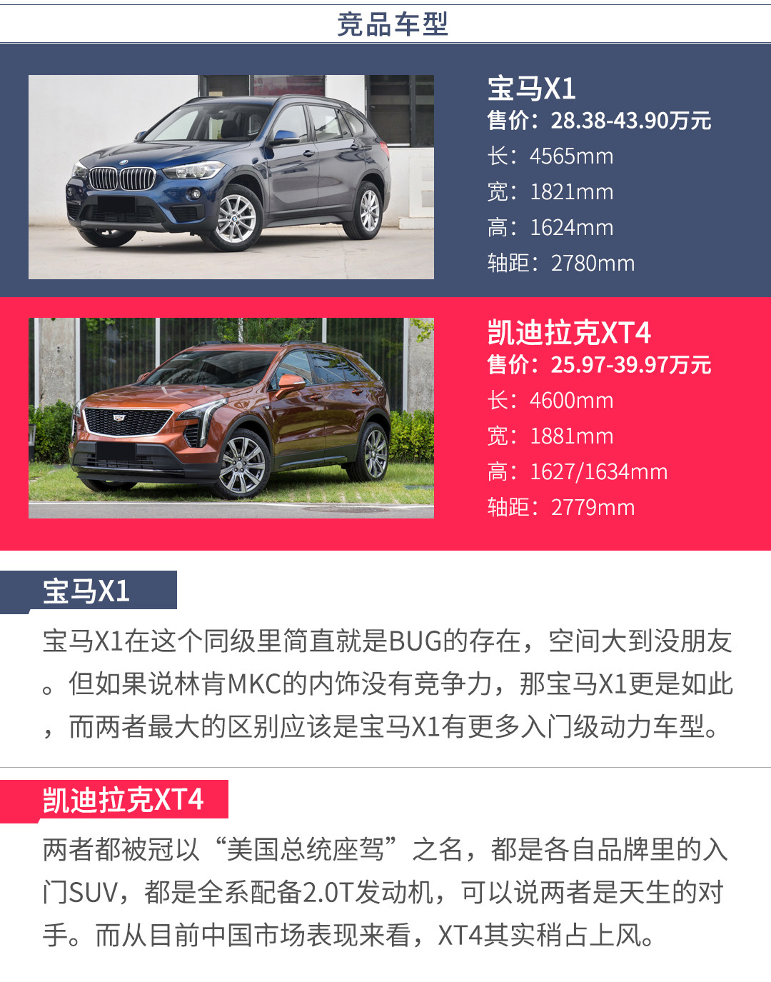 相对竞品车型,新款MKC的最要优势还是在于高大上的全新外观上,还是丰富的配置,而不足也当然是在于价格方面,毕竟目前仍然是进口车型,在这方面确实难以和已经国产的竞品抗衡,不过如果你的预算稍微多一点的话,MKC确实是以个非常不错的选择。