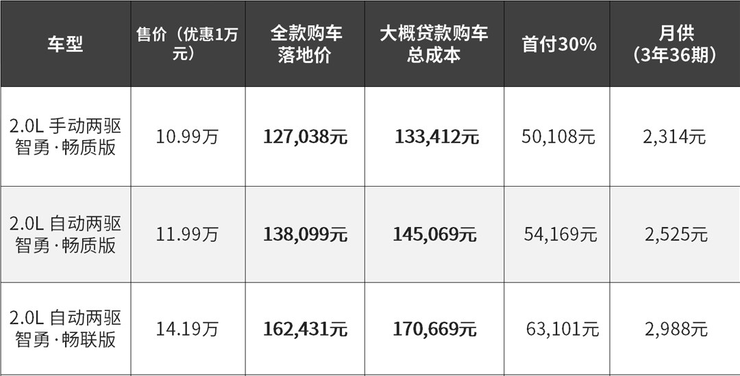 以上三款车型分别为最低配、次低配、次顶配车型,相信通过上面的表格大家对于现代ix35的真实购车成本一目了然,如果你只需要自动挡和够用的配置的话它的2018款 2.0L 自动两驱智勇·畅质版车型贷款的总价格在15万内能落地,这对于一款标准的紧凑型SUV来说还是挺实惠的!而这样的购车成本其实和自主品牌的SUV相差无几。