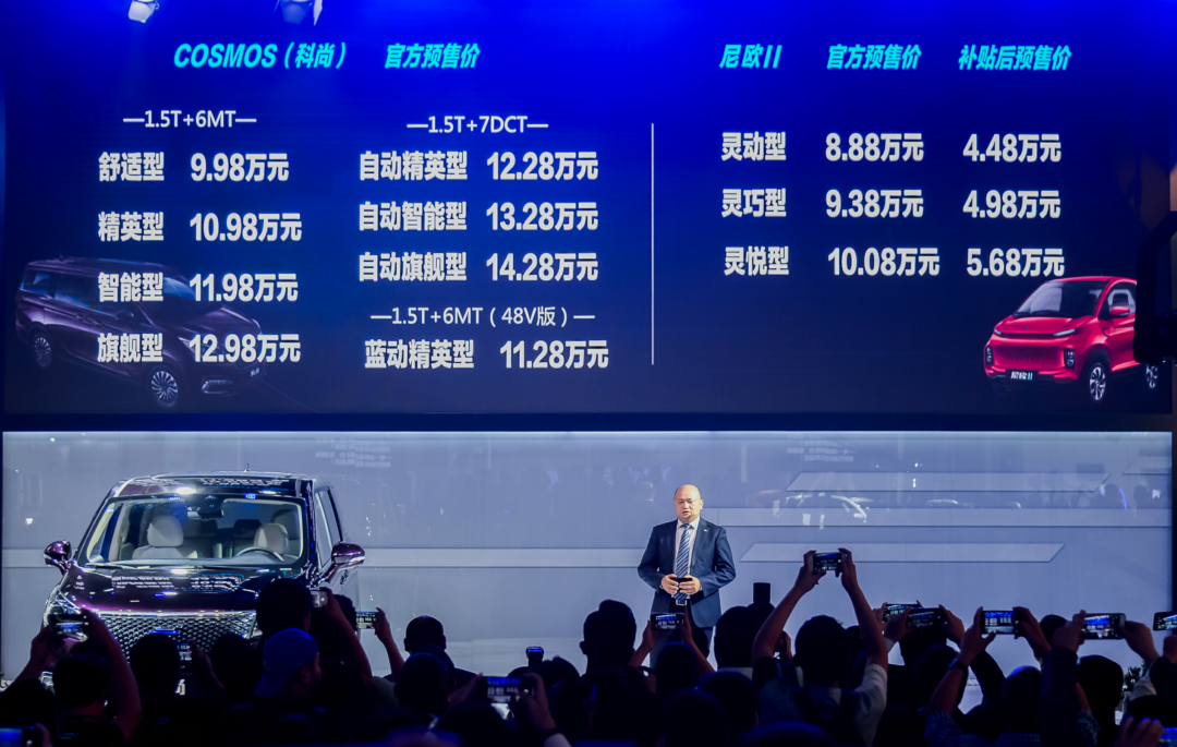 COSMOS(科尚)&尼欧II预售价格公布。在本次广州车展上,COSMOS(科尚)共发布了燃油版和混动版共计8款车型,预售价格区间为9.98-14.28万元。其中,燃油版共推出4款1.5T+6MT车型和3款1.5T+7DCT车型。