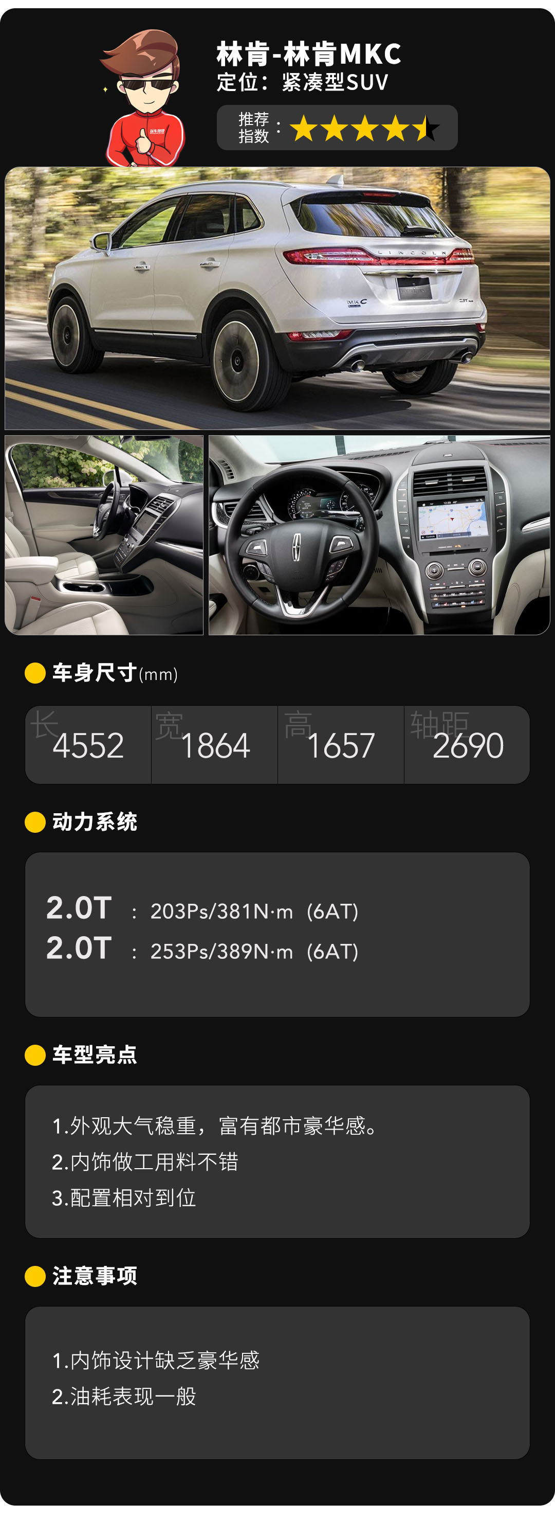 动力搭载了2.0T EcoBoost发动机,分高低功率两个版本,同时也提供前驱和四驱可选,而一般情况下,低功率和前驱就完全足够了,传动系统匹配6速手自一体变速箱。点评:对于林肯MKC各方面表现都在同级中有一定水准,而外观的高级感和配置上的表现尤为出众,注重这两点的朋友绝对不容错过。