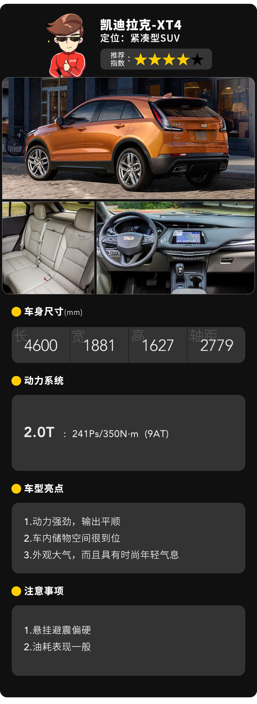 动力部分,凯迪拉克XT4全新配备2.0T发动机,241马力的最大功率也是同级难分对手的,但是强劲的动力也只是它其中一个亮点,还有更受消费者好评的是全新的9AT变速箱也是全系配备,平顺性可圈可点。所以综合而言,XT4的表现确实非同一般,每个方面都有着一定优势,如果硬要说缺点,可能也就油耗上还是有待提高了,但是毕竟2.0T动力,哪有跑得快的马儿不吃草呢?