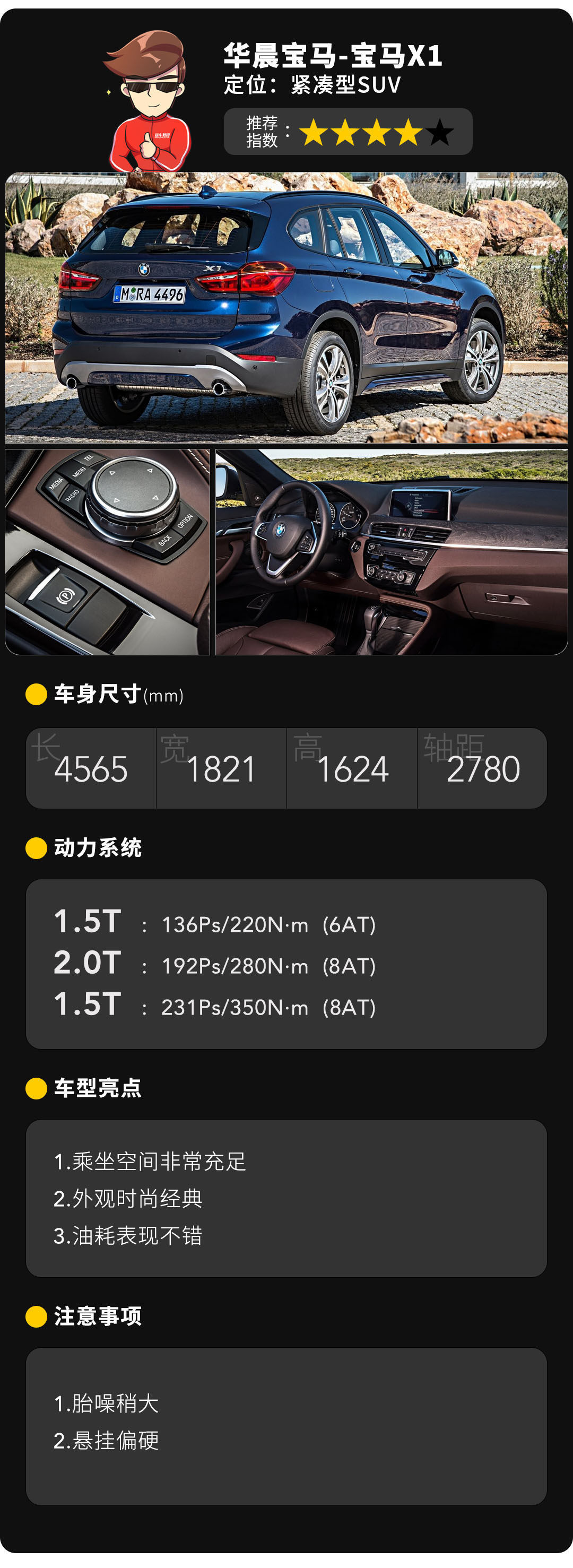 由于宝马X1早已实现国产,所以在售价上和许多进口的竞品车型无疑是更有优势的,同时1.5T动力车型也把门槛拉得更低,优惠过后也就20万出头的价格。当然大家都知道1.5T三缸发动机的行驶质感有点瑕疵,但是作为目前最热卖的紧凑级豪华品牌SUV,这么多车主的认可下,这点应该无需多虑吧。不过如果你是在不喜欢1.5T的话,加点预算买2.0T四缸的也是一个非常不错的选择。