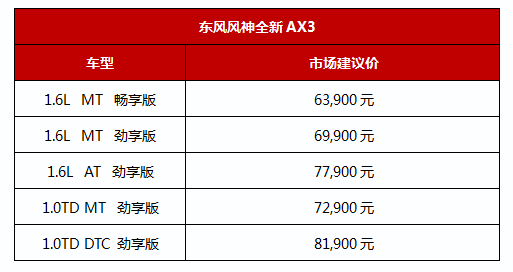 令人惊喜的是,全新AX3新增的1.0T涡轮增压直喷发动机,凭借其强劲动力、高效低耗、静音舒适、可靠耐用等特点,获得了“中国心”2018年度十佳发动机殊荣。这台综合性能处于世界同级别领先水平的小排量涡轮增压发动机由东风自主研发,搭配格特拉克6DCT变速箱,百公里油耗低至5.2L,在经济性方面进一步提升了全新AX3的竞争力。