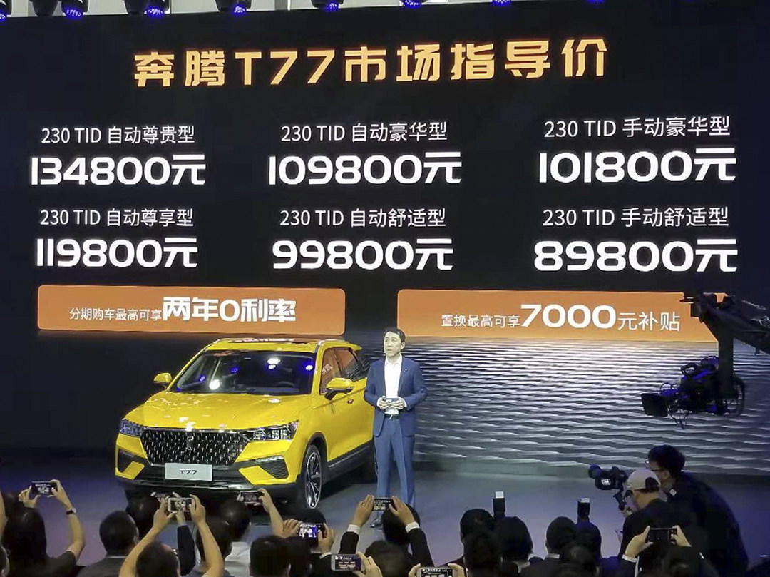 一汽奔腾全新紧凑型SUV#奔腾T77#在#2018广州车展#上正式上市,售价8.98-13.48万元,这是一汽奔腾更变品牌形象的首款SUV。最显著的特征莫过于凹面的中网格栅,点阵式的造型十分具有侵略性,并且全新样式的车标也似乎在宣告着一汽奔腾在未来的全新产品样貌。流行元素是T77的设计主旨,内饰具有多种现下众多品牌都在采用的方式进行处理,看上去相当年轻动感;这款新的SUV搭载1.2T涡轮增压发动机和7速双离合器变速箱的动力总成,智能互联、年轻动感等元素都是T77最新的产品特性,是否能带领一汽奔腾这个品牌走向热销的领域,将会是未来一年内都值得期待的亮点。