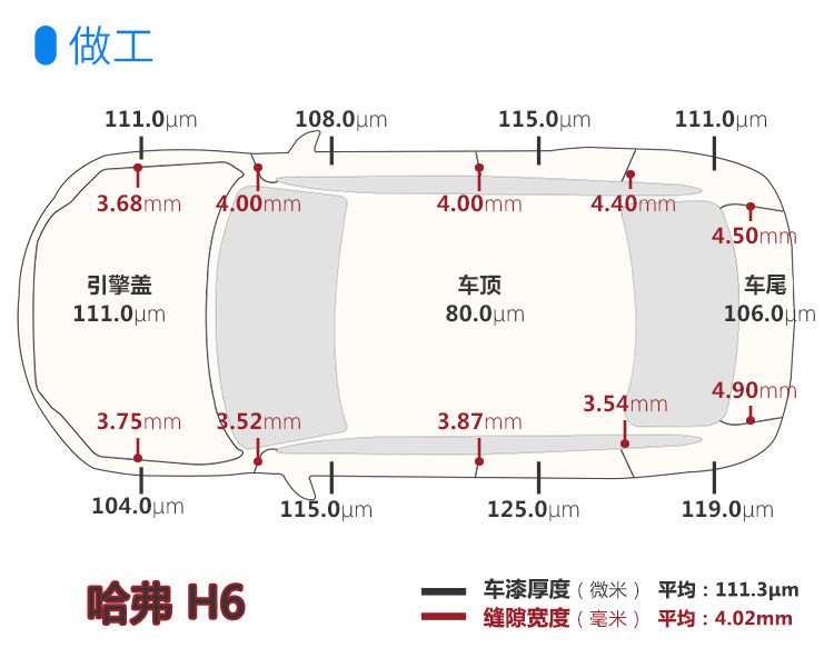 由图可得,哈弗H6的车漆厚度范围误差(全距)为45μm,缝隙宽度范围误差是1.38mm。