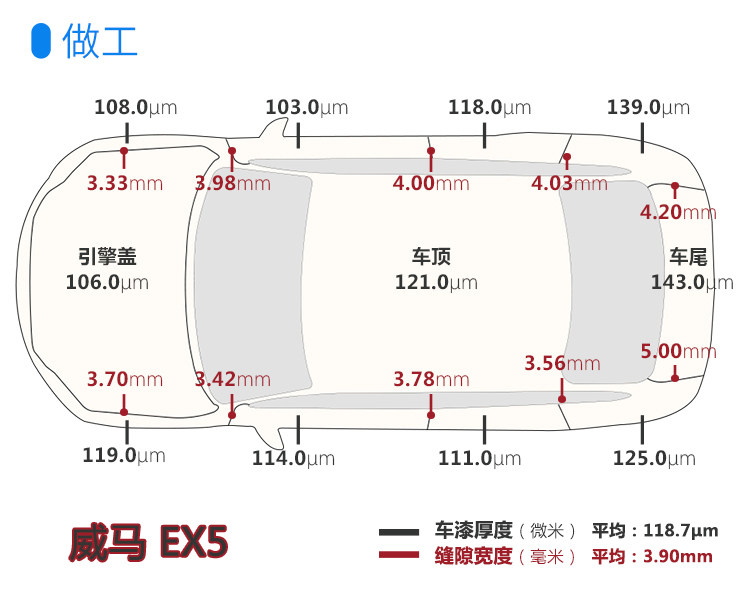 由图可得,威马EX5的车漆厚度范围误差(全距)为40μm,缝隙宽度范围误差是1.67mm。