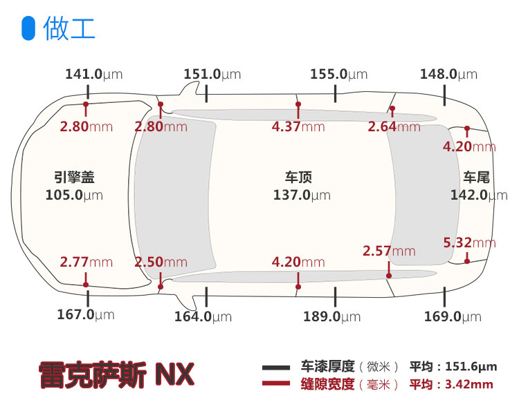 由图可得,雷克萨斯NX的车漆厚度范围误差(全距)为84μm,缝隙宽度范围误差是2.82mm。