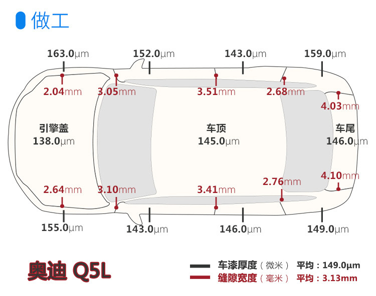 由图可得,奥迪Q5L的车漆厚度范围误差(全距)为25μm,缝隙宽度范围误差是2.06mm。