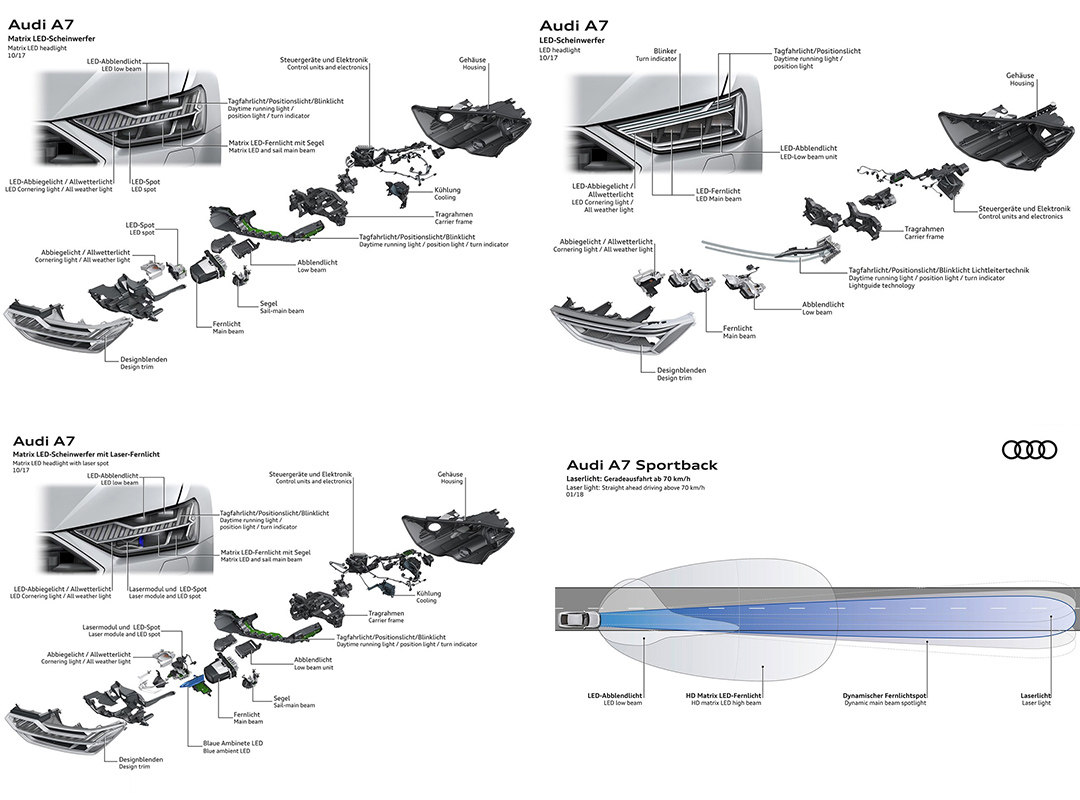 说起大灯,作为灯厂的奥迪为A7准备了三套不同的前大灯组,分别是LED前大灯、矩阵式LED前大灯,以及带有激光大灯的矩阵式LED前大灯,激光大灯最大的好处在于相比普通远光灯拥有更远的照明距离,为驾驶员提供更远的夜间可视范围。