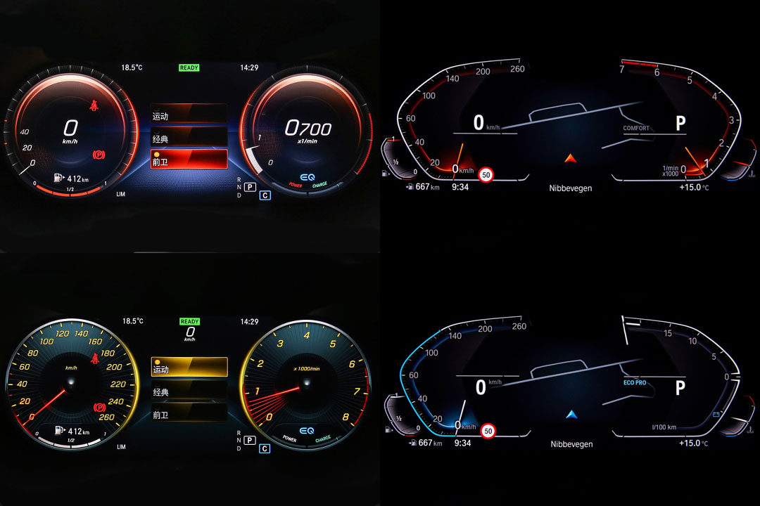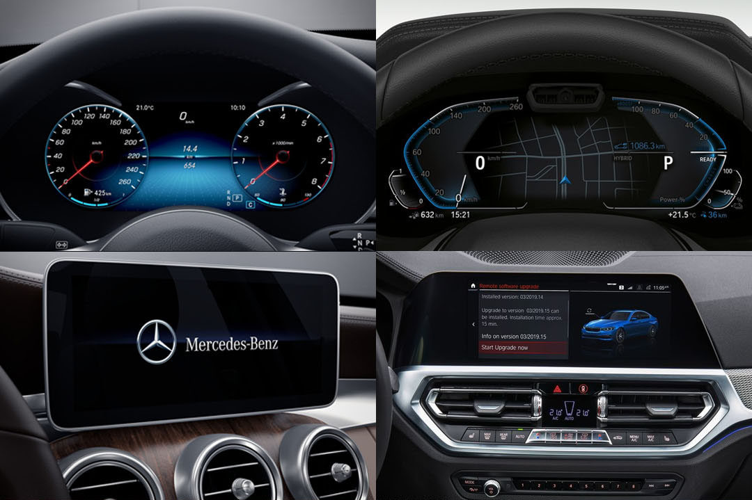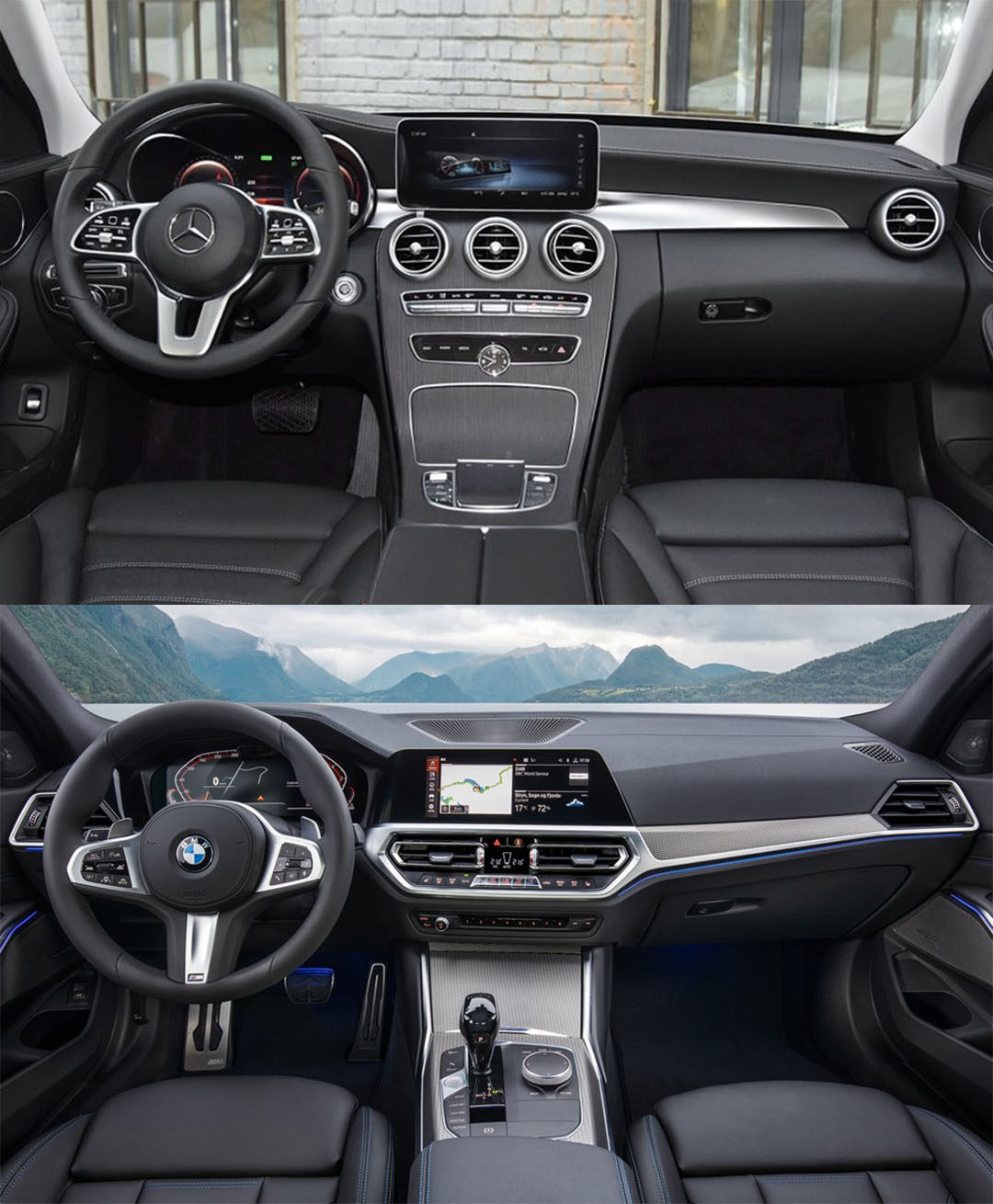 首先两款车型都跟随主流,换上了全液晶的仪表,但奔驰C级的显示效果仍然保留了传统的双圆表,宝马3系则应用了更前卫的设计。旧款C级的中控屏尺寸一直被吐槽太小了,而新款也终于换上了更大尺寸的,不过相比之下,仍然是宝马3系的中控屏更有科技感。