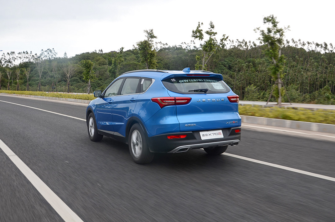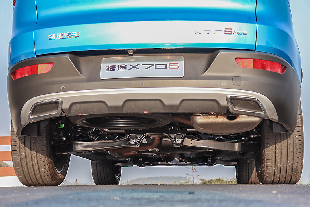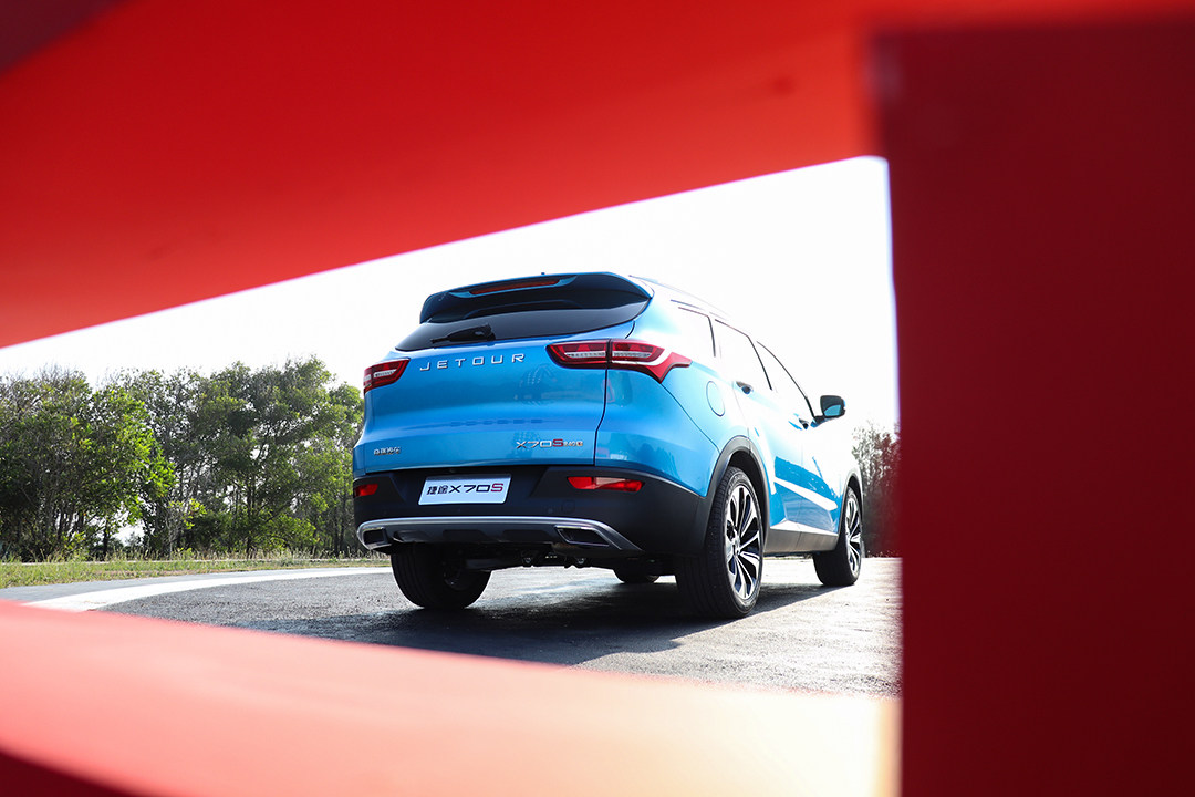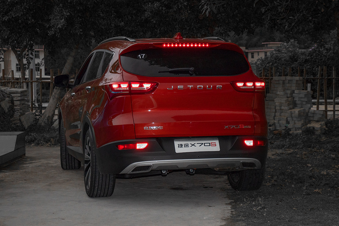 来到尾部,车尾造型与捷途X70如出一辙,仅仅在“X70S”的硕大标识示出差异化。看似双出的排气布局实则为后包围上的装饰效果,隐藏式排气布局容易在冬季用车时露怯。得亏点亮后视觉效果出众的LED尾灯和分段式刹车灯为其实力挽尊。