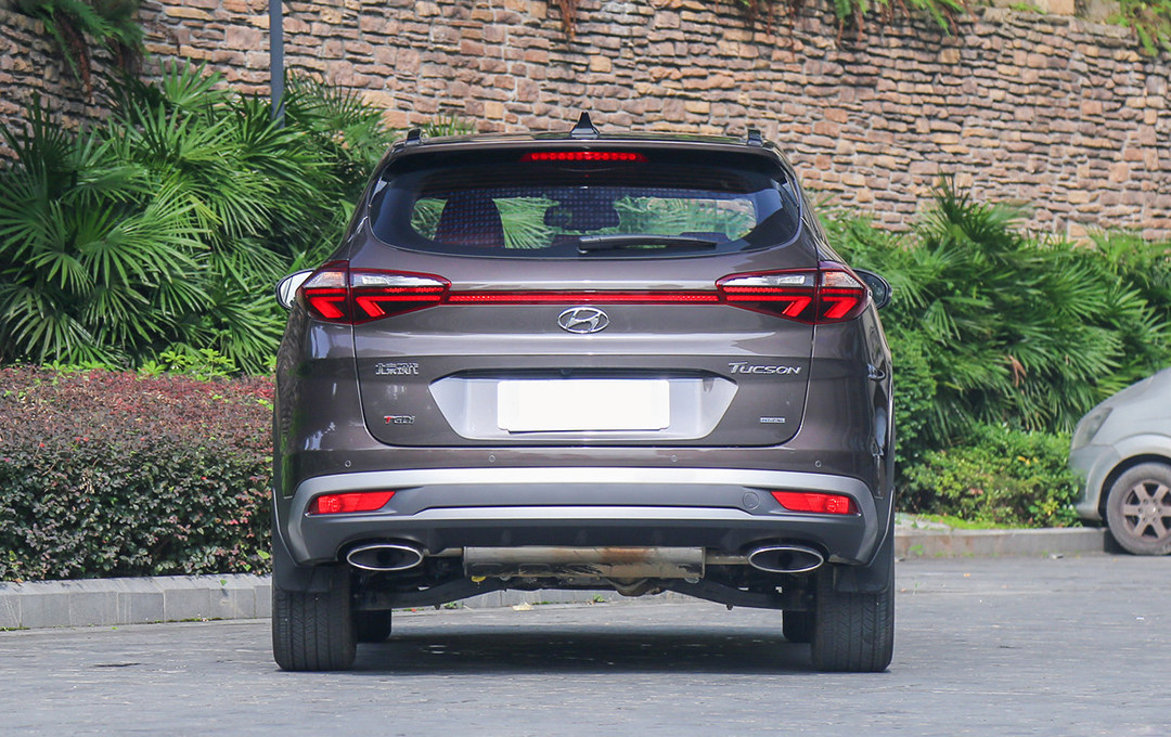 要说教授最喜欢的,便是全新途胜的尾部。下宽上窄的造型饱满敦实, 采用时下流行的贯穿式尾灯,搭配两侧倒勾形灯带,晚上点亮起来辨识度十足,下方排气为双边两出式,尺寸不小,运动感很足。