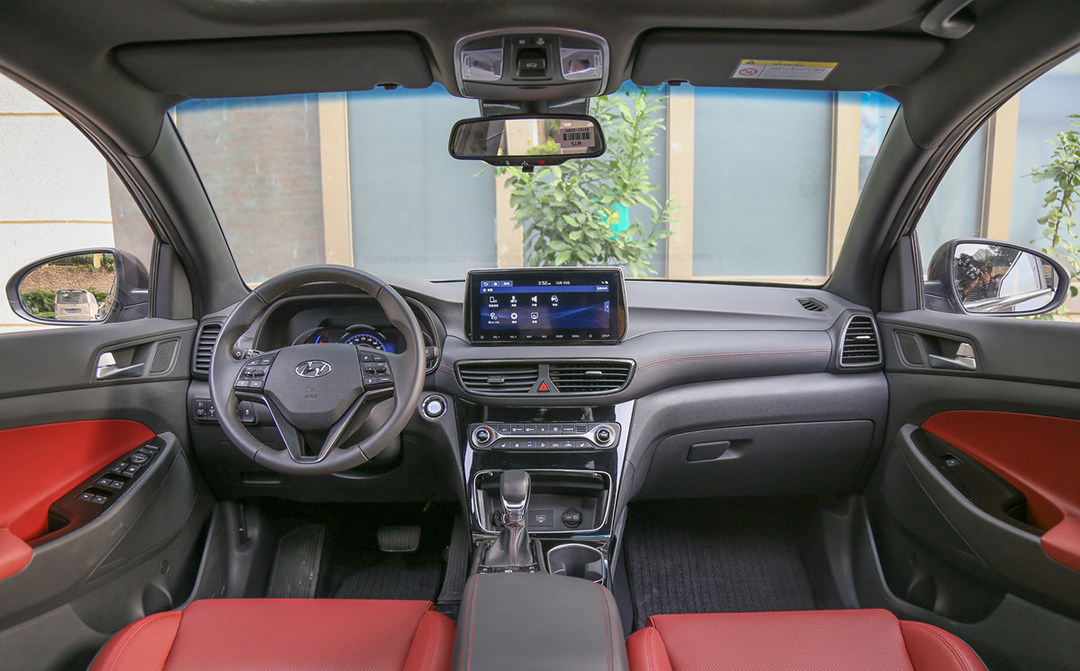 黑+酒红是全新途胜新增的内饰配色,十分激情洋溢。全新设计的中控台风格简洁,各功能区域布局清晰,门板与中控台等与人高频接触的位置均采用了皮革包裹,做工和用料都值得好评。中控屏由原来的内嵌式改为悬浮式是新车比较明显的改动,10.25英寸的大屏搭配全液晶仪表科技感十足。