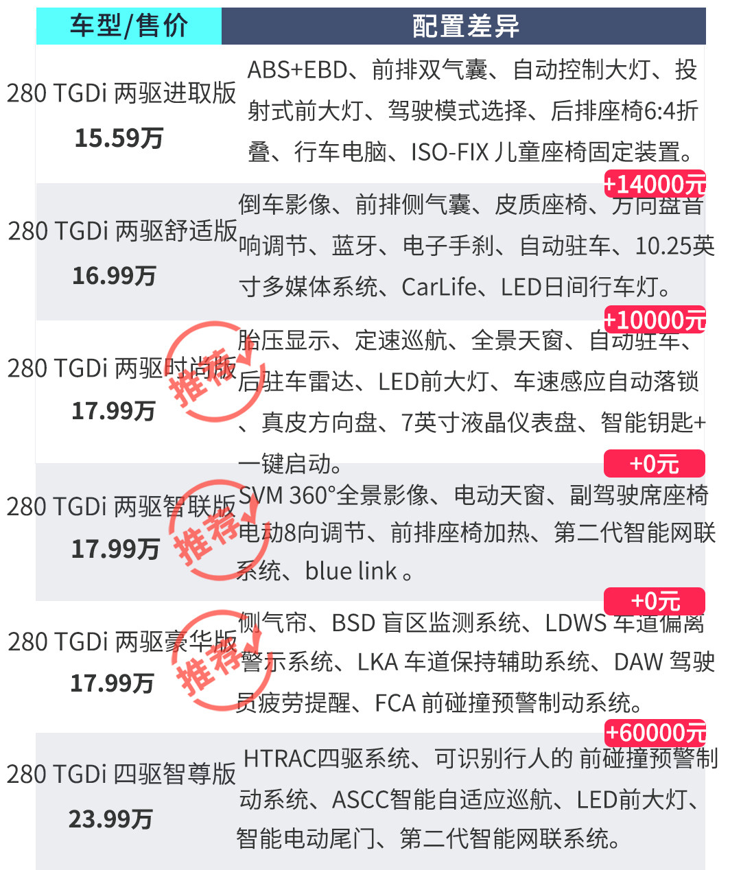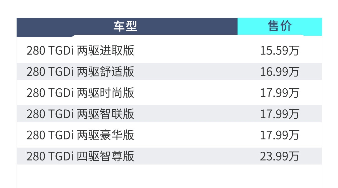 如此看来,消费者可以针对自己的喜好选择不同的车型了。举个例子,如果是选择两驱时尚型,则不能同时拥有智联与主动安全系统,LED前大灯只有时尚型和顶配车型才有;而选择两驱智联型,也不能同时拥有舒适性配置及多方位的安全配置。如果都想要的话,顶配车型的价格有些高了。