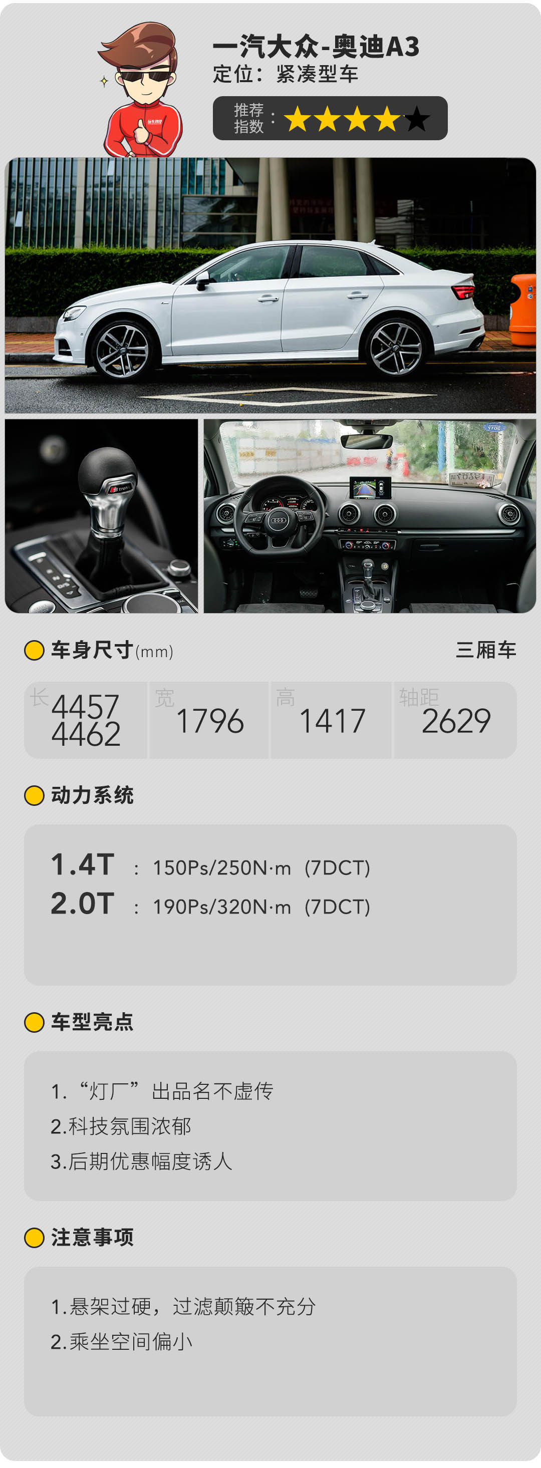 A3作为BBA乃至所有豪华品牌的紧凑型轿车中最早实现国产化的车型,加上背靠大众集团这座大山,比起其他的参赛者要更懂得如何有效且准确地捕捉国人的心思。19.05万的同级最低起售价将市场的目光聚焦在自己身上,后续再放出少则2,3万,多则5,6万的优惠力度将彻底击溃你的内心防线。自上市以来,稳居细分市场的冠军宝座也就是自然而然之事了。