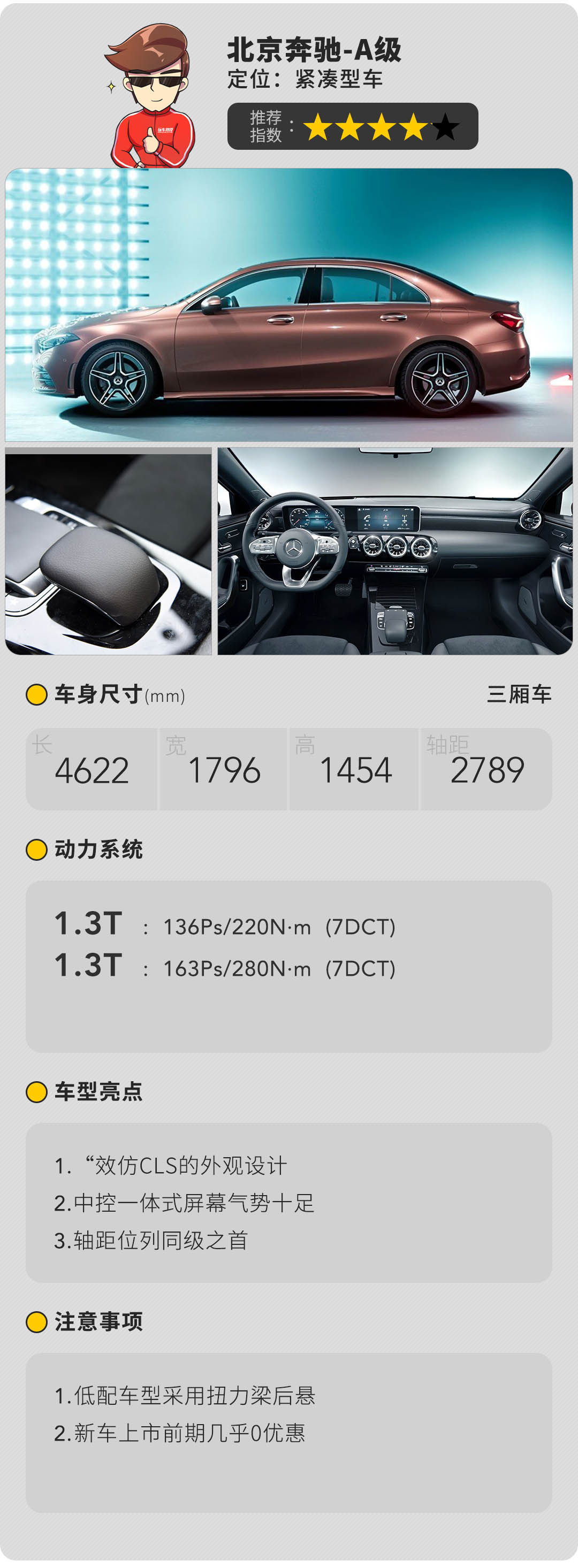 正所谓“好饭不怕晚”,最后呈现出来的成品并没有辜负我们长久以来的等待,基于MFA2平台打造而来,秉持着专为国人而设的理念,国产后的A级在尺寸上进行全方位的升级,尤其以轴距最为突出,2789mm的数据不仅令A级的轴距一下跃升至同级之最,更为其二排带来近乎于中型轿车乘坐空间。此外效仿CLS的外观,借鉴E级内饰,内含MBUX智能系统的一体式屏幕均是A级的加分项。不过在低配车型配置清单上赫然在列的扭力梁式后悬有损豪华身份。