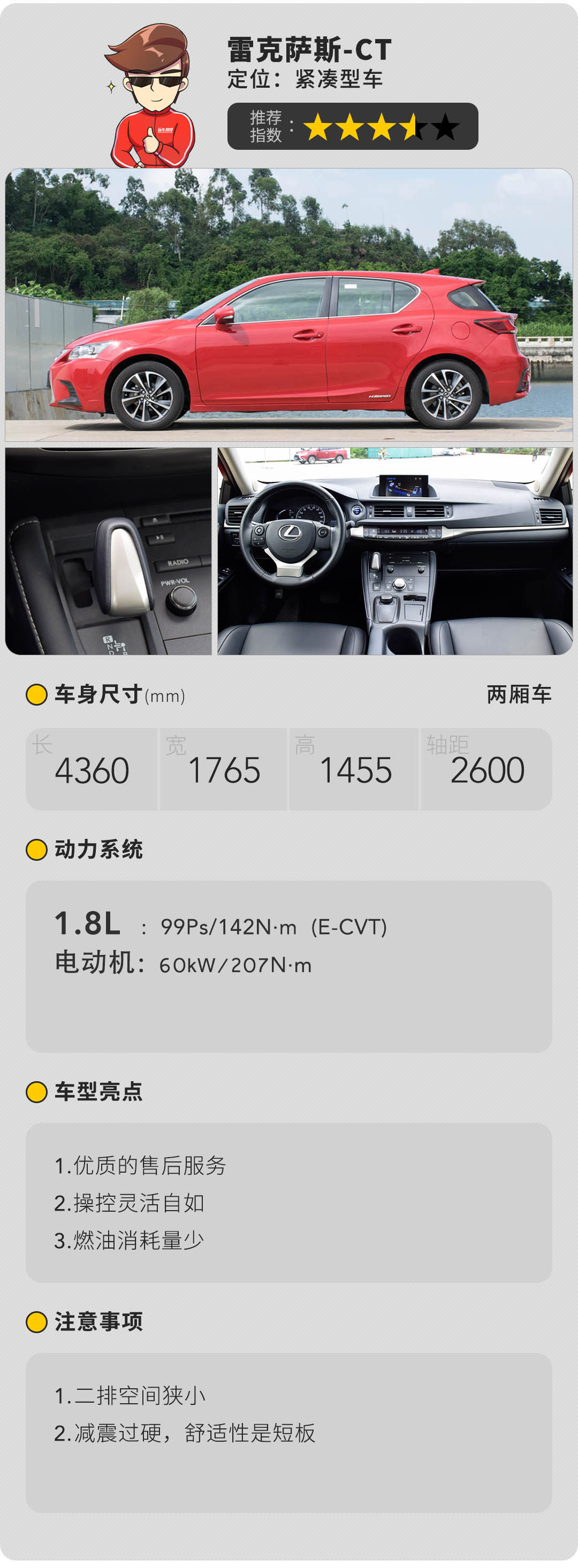 纯进口、极致的设计美学、始终坚持两厢的身段不随大流硬把自己拉长、做大以确保最纯粹的驾控体验、硬道十足的底盘,雷克萨斯CT就宛如一尊“可远观而不可亵玩焉”的圣物。因为普通的平凡人都难以接受形同“鸡肋”的二排、昂贵的售后保养费用、以及最为关键的冲击感明显的底盘。但当你顿悟世间真理之后,也许就是开始认同这尊圣物之时。
