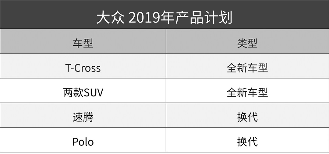 今年大众推出了不少的产品,朗逸、帕萨特的换代;探歌、探岳、途岳的上市,名字已经傻傻分不清楚;还有途观L新能源的到来,开启了大众在国内的新能源车之路。那在接下来的一年,大众还会给大家带来什么新车呢?现在比较明确的是,2019年大众会新增3款SUV,已经亮相的T-cross会是其中一款,剩余两款SUV还处于一个比较神秘的状态。与此同时,Polo和速腾在明年完成换代几率也比较大。