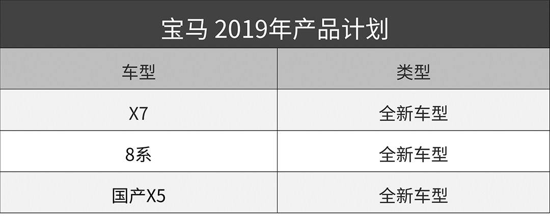 比起奥迪和奔驰,宝马的2019年新车计划就显得单薄了些。毕竟,2018年可谓宝马的产品大年,特别是宝马X家族的升级:新宝马X2、宝马X3、宝马X4以及全新宝马X5都被一一推出。明年稍稍歇一歇也正常。那根据目前可知道的消息,宝马要在明年重点推出的车型是宝马8系、宝马X7,以及宝马X5也会是比较大的一个关注点。其中,宝马X5国产化也有可能在明年有进一步的消息。