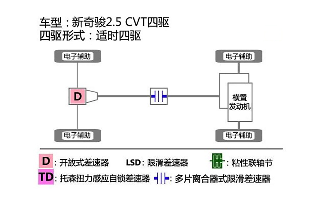 值得注意的是奇骏所搭载的四驱是4X4-i智能全模式四驱(其实也就是个适时四驱),与一般用于防滑的适时四驱不同,它提供了2WD、AUTO以及LOCK三种驱动模式,其中在LOCK模式下可以锁定前后轴的动力分配为50:50,以保证在非铺装路面时有足够的脱困能力,当然了,这个四驱的脱困、越野性能虽不能和硬派的越野SUV相提并论,但对于在当下的大部分地区来说,偶尔撒个欢还是没有啥问题的。