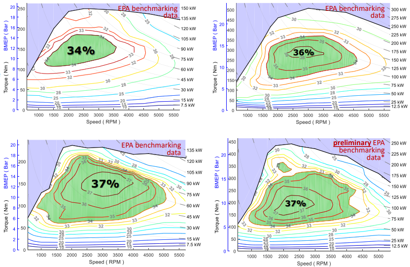 为了方便理解,一般汽车厂商都把各个工况下的油耗转换成热效率,近些年在严苛的油耗法规下,热效率这个词在发动机上出现的频率越来越高,总的来说热效率高发动机燃油经济性会更好,按照目前的水准,涡轮增压引擎热效率应该在38%以上才算优秀,自然吸气引擎是40%。但是紧盯着热效率看也不完全对,因为发动机最高热效率仅仅在特定的工况下能实现,日常行驶很少达到这样条件。