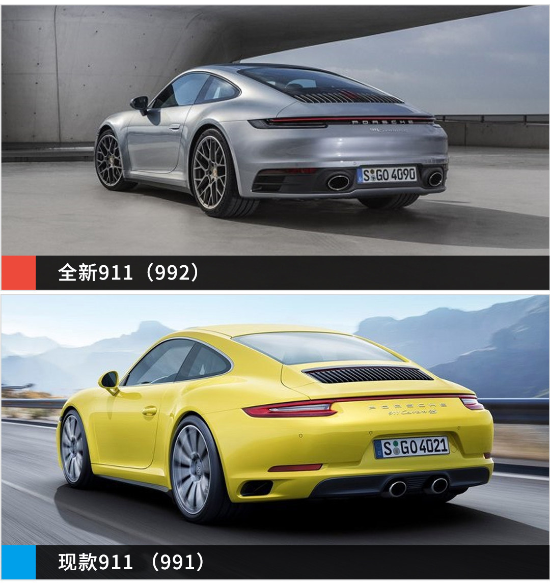 尾部则是变化最大的部分,全新911换装如今最新家族样式的贯穿式尾灯,而现款911系列仅仅四驱车型为贯穿式尾灯。并且尾部造型更为扁平细长,视觉重心更低,少了上代的圆润感。
