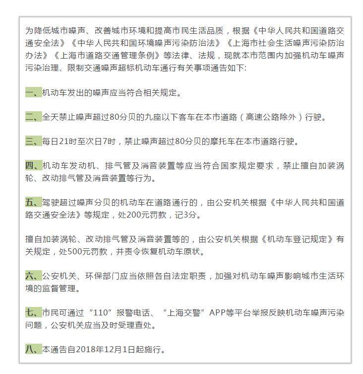 上海近日发布一则通告称:自12月1日起,噪声超过80分贝的九座以下客车禁行上海市地面道路,而且是全天禁行(高速公路除外);自12月1日起,紧致噪声超过80分贝的摩托车在上海市道路行驶。该项规定的出台或许是为了将非法改装车进一步扼杀,且为了营造更为安静舒适的道路环境;但也有可能影响很多原厂大排量汽车的车主的出行,和上海当地的部分高性能车型的销售。(消息来源:“上海发布”公众号)
