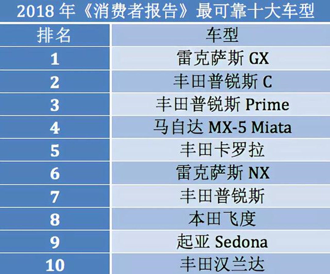 不久前,美国《消费者报告》公布了2018年美国市场上消费者认为质量最可靠的十大车型,那我们先来看看这份排名,瞧一瞧哪些车型上榜。