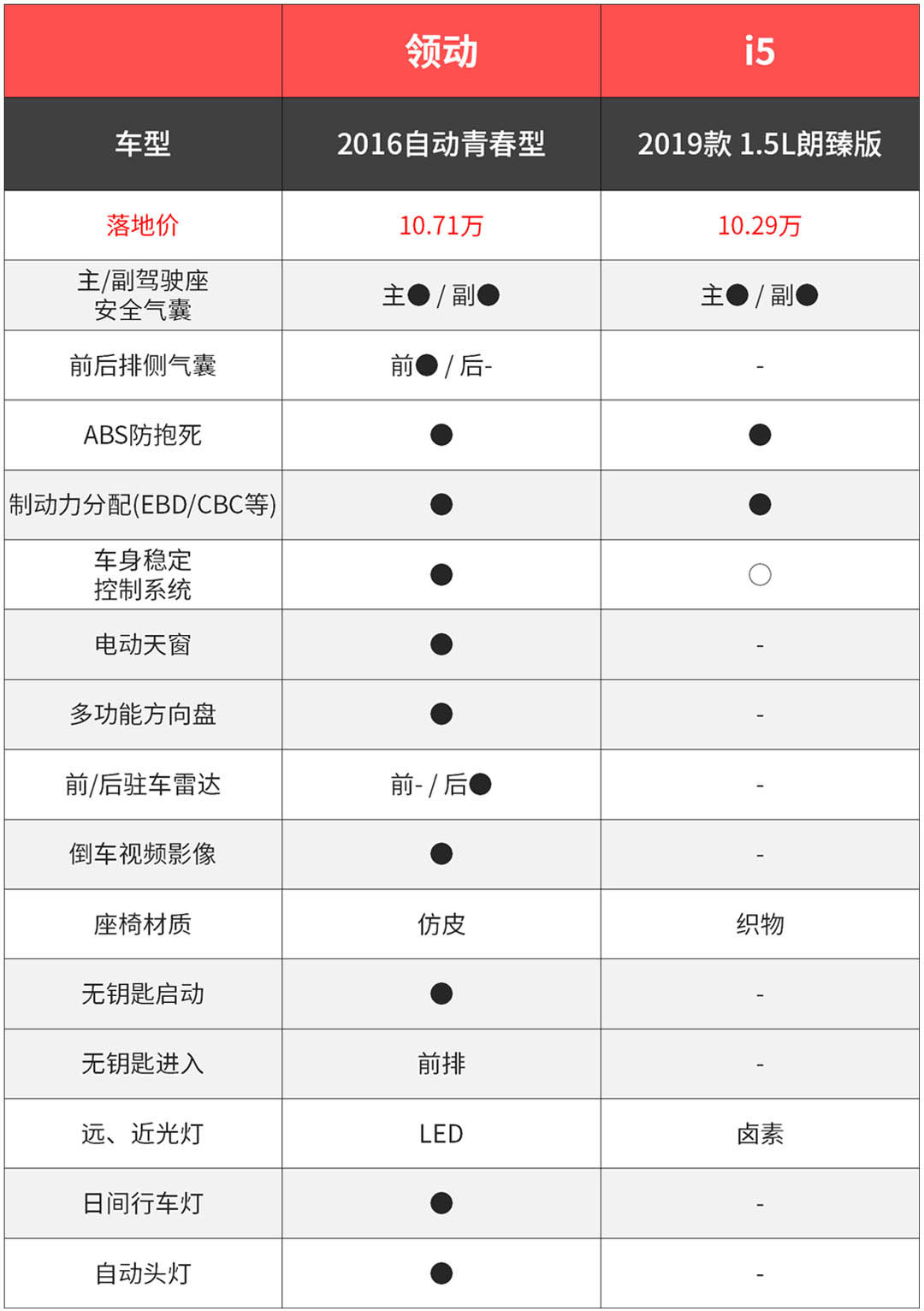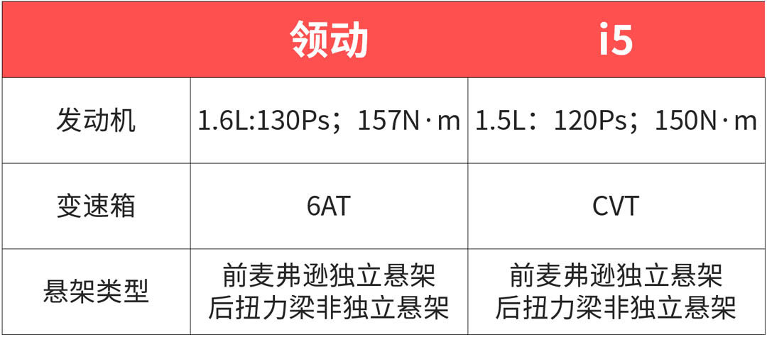 在驾驶感受上每个人的偏好都是不同的,有人选择温和一点的i5;有人选择暴躁一点的领动。不过在配置上大家的选择都是一样的,同样的钱我肯定希望买到的东西多。安全上i5比领动多了前排侧气囊、刹车辅助、牵引力控制、车身稳定系统;娱乐上i5比领动多了中控彩屏,支持手机映射,丰富驾车体验。还有其他的一些配置大家可以看表。