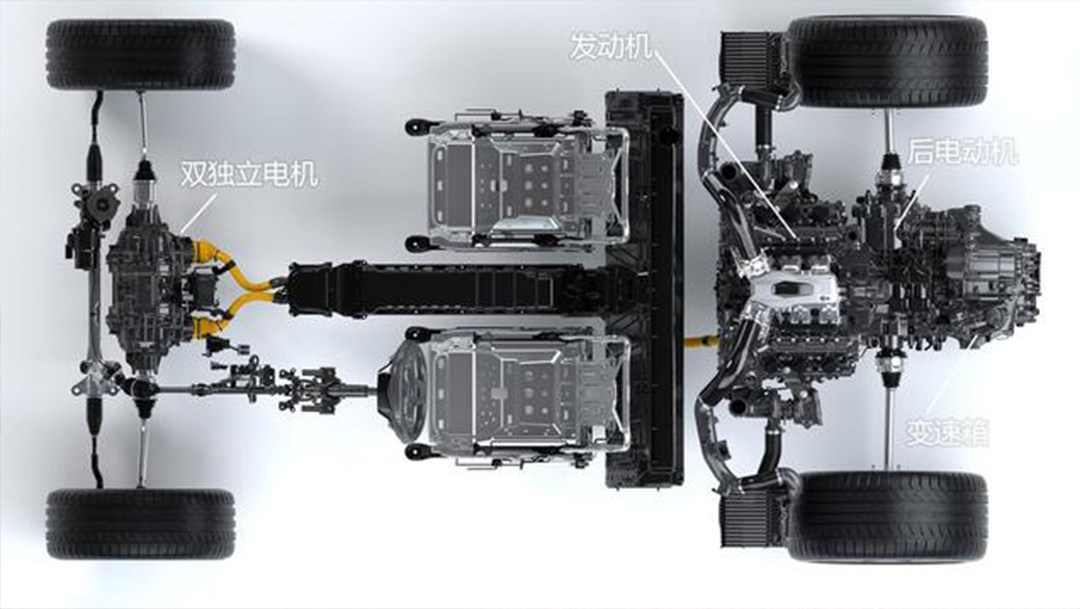 它的动力总成是一套插电混合系统,跟NSX的布局相似,它是通过后置一颗拥有231Ps,最大扭矩320N·m的1.5T三缸引擎配合能量回收电机(此电机不参与驱动车轮,只作能量回收与抵消引擎涡轮迟滞)+拥有131Ps、峰值扭矩为250N·m的前置电机共同协作组成,它四驱状态时能输出总峰值马力362Ps以及总峰值扭矩570N·m