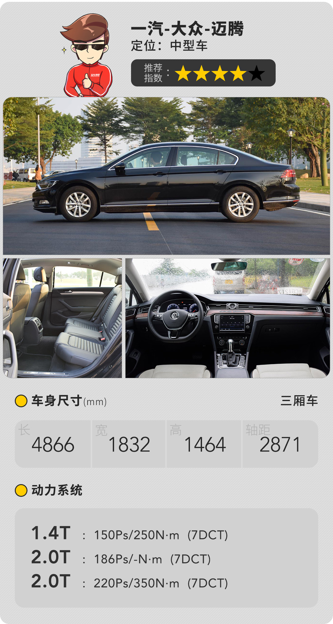 迈腾是大众在中国首次采用MQB平台的车型,以综合表现良好和出色的产品力,被消费者称为中级车型的标杆。在外观设计上,迈腾成熟稳重的设计感就赋予了自己更广的受众面,家用商用都十分合适。其次是内部空间,2871mm的轴距带来的空间表现与君威、凯美瑞等同级别对手相比也更加出色。