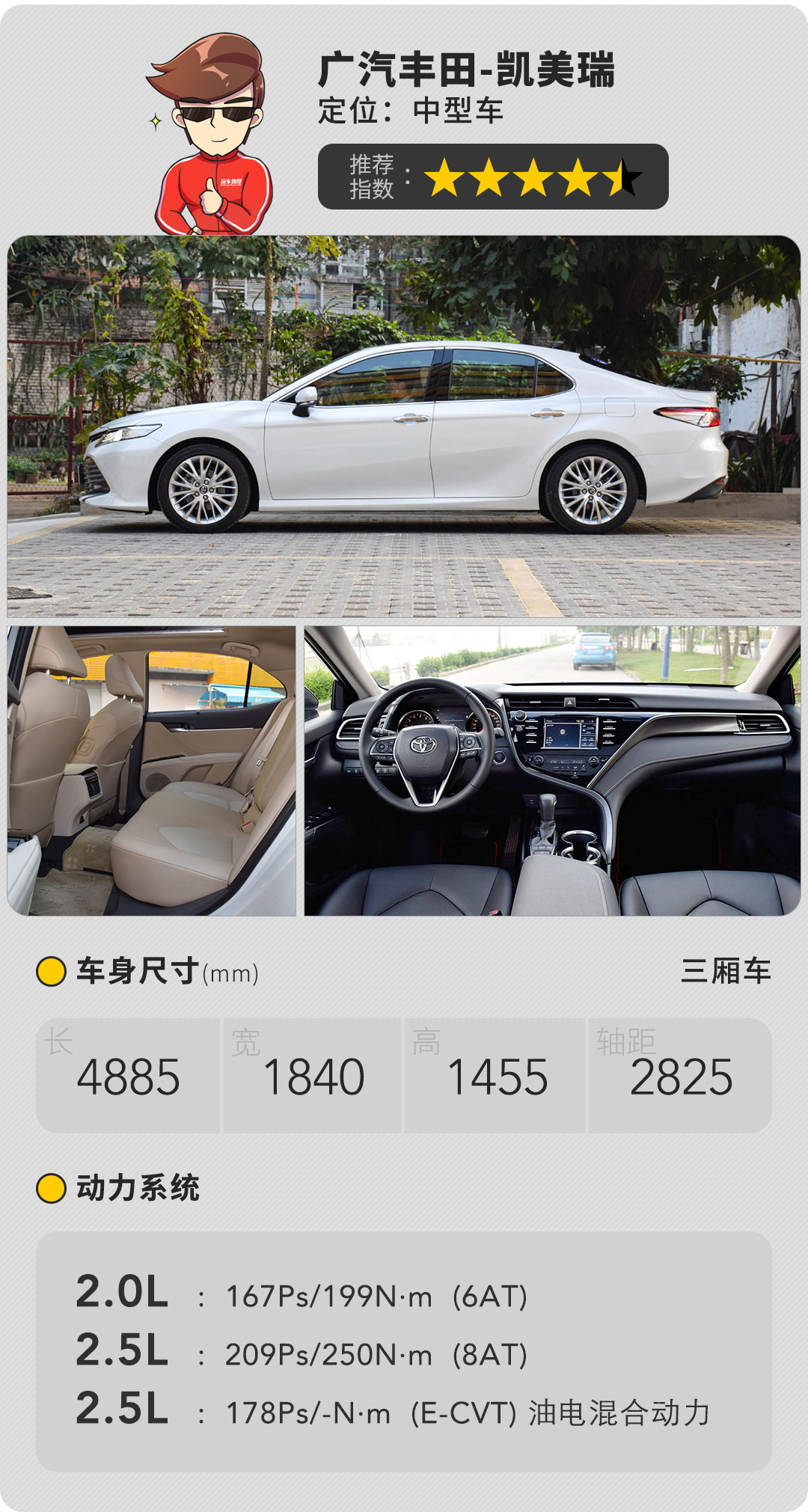 凯美瑞在中型车中也是属于非常多消费者的家用首选车型,保值率自然是一大亮点,而且超高的性价比和相对全面的配置都为行车品质加分不少。