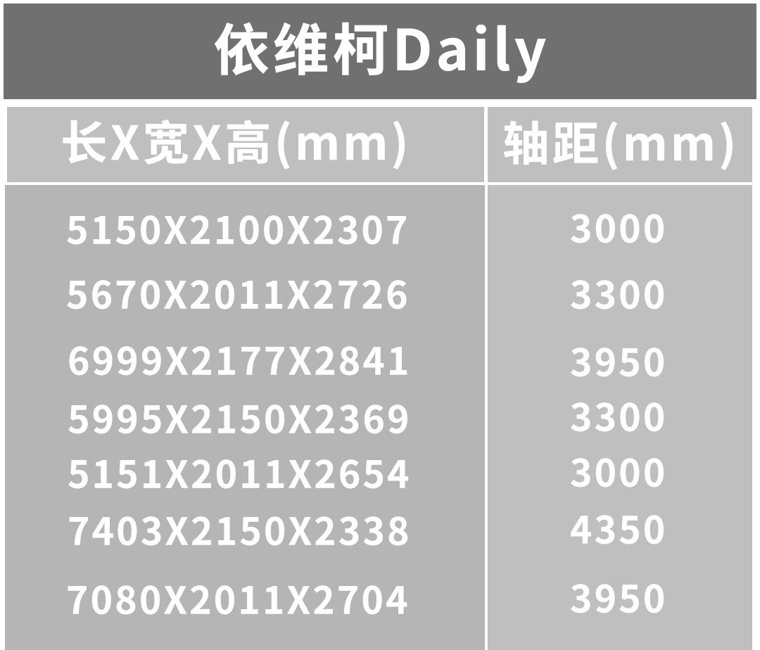 依维柯Daily的车身尺寸选择繁多,分别有长/短轴、高/低顶、客/货车等可以选择,好开是它最大的特点,不论是高速的稳定巡航,还是较小的转弯半径,都让它开起来不像是一辆笨重的“轻客”,反而在空间非常实用的情况下它还保持着非常写意的驾驭体验。