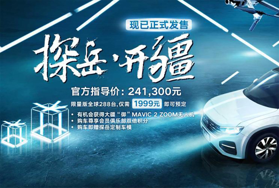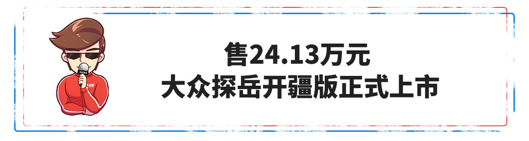 日前,一汽大众正式上市探岳开疆版,官方指导价为24.13万,限量288辆发售。与普通车型不同,开疆版在细节上进行了修改,例如采用双色车身、提供自动前大灯以及自动防眩目后视镜等配置。动力方面继续搭载2.0T发动机,最大功率186马力,最大扭矩331牛米,匹配7速双离合变速箱并配有4MOTION四驱系统。作为一款限量版车型,开疆版诚意还算及格。