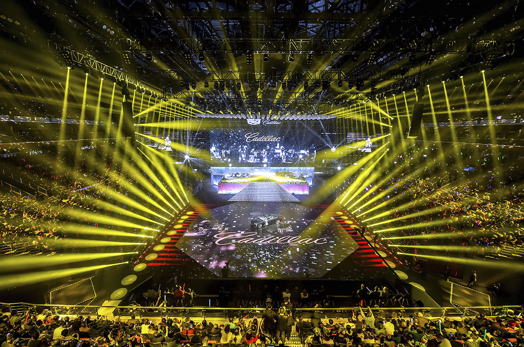 舞台主要是以凯迪拉克经典遁形标识为设计主题,配以炫酷的地面投影来打造极具冲击力的感官体验;并充分利用了凯迪拉克中心的场地高度和地面广度,营造了一个充满殿堂氛围的立体感舞台。现场观众不仅能享受到一场精彩绝伦的视听盛宴,也会从中感受到凯迪拉克品牌所传达的“突破想象”的理念。