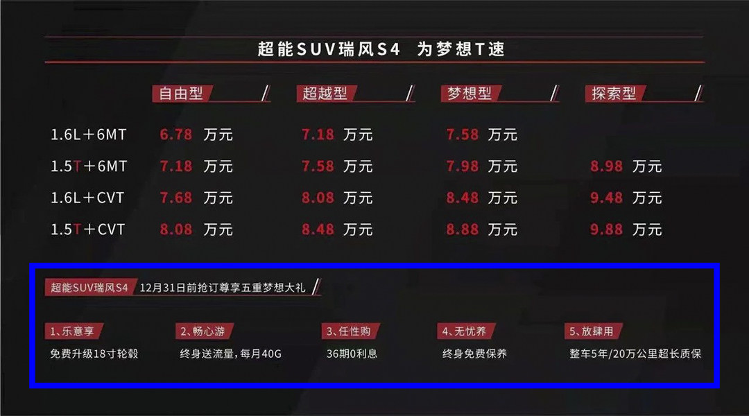 江淮瑞风S4是在广州车展期间上市的一款全新小型SUV;全系售价不超过10万元以及购新车礼遇不错,吸引了不少车展观众的注意。特别是有意在近期买新车的消费者,看到免费升级18寸轮毂、终身送每月40G流量、3年零利息、终身免费保养、5年/20公里质保,这五大礼,很自然会想去多了解一下。这就跟吆喝“最后几天,走过路过不要错过”的效果很像,消费者抱着好奇心也会想多看几眼。