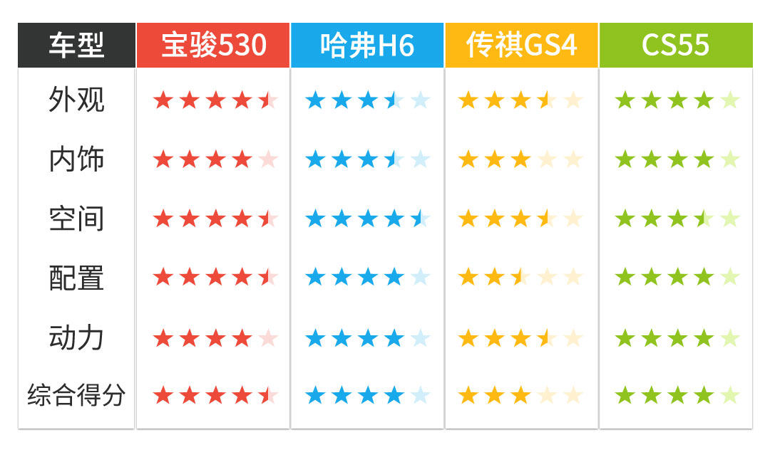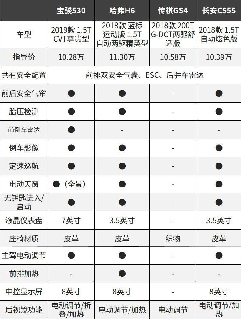 配置小结:总体而言,宝骏530的配置无疑是最能吸引当下消费者的,而且价格在对比的四车中也是最低的;而传祺GS4是则是比较普通,看点不足,在配置这一项失分较多。